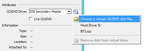 12. Now select ‘Choose a virtual CD/DVD dis file’ and browse to the directory where your ISO or Image file is stored. In this case i will just browse and select BT5.ISO image from my hard drive. And just click OK.